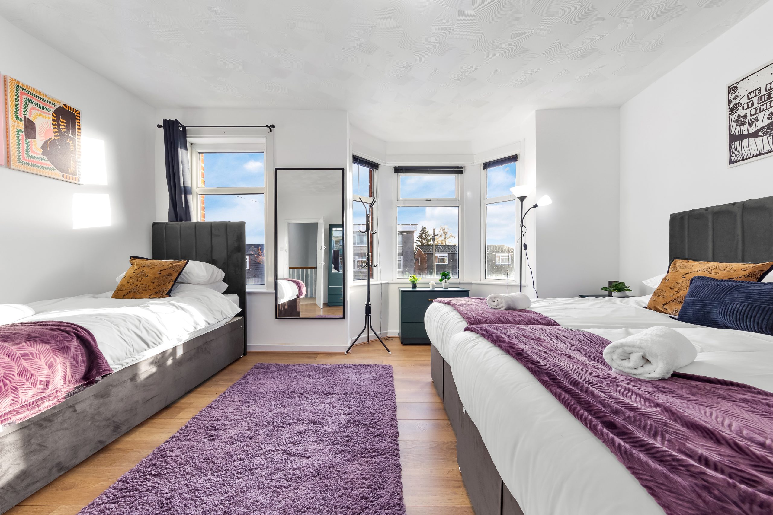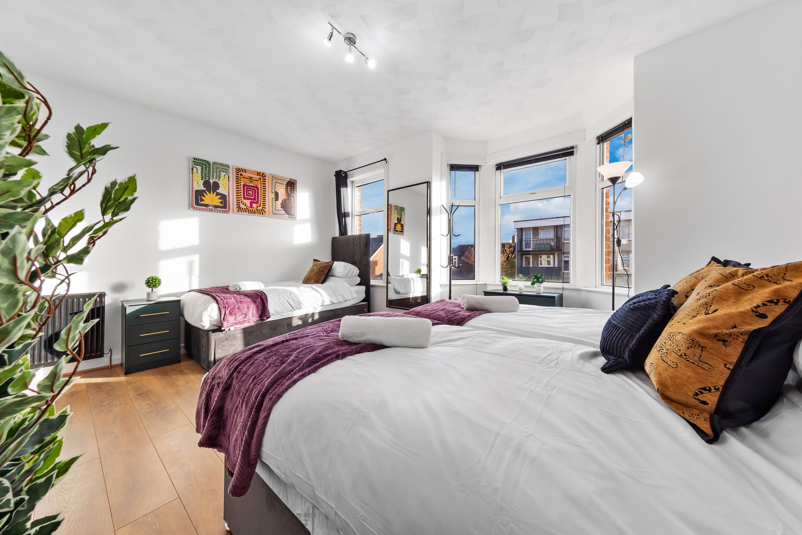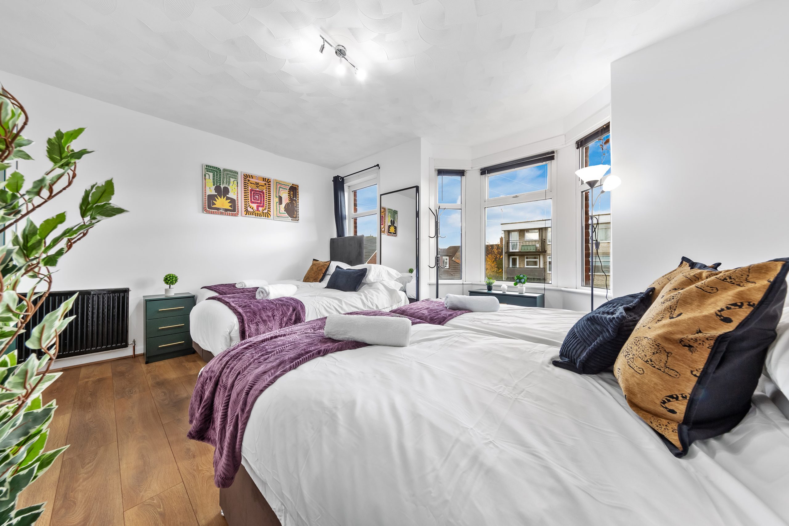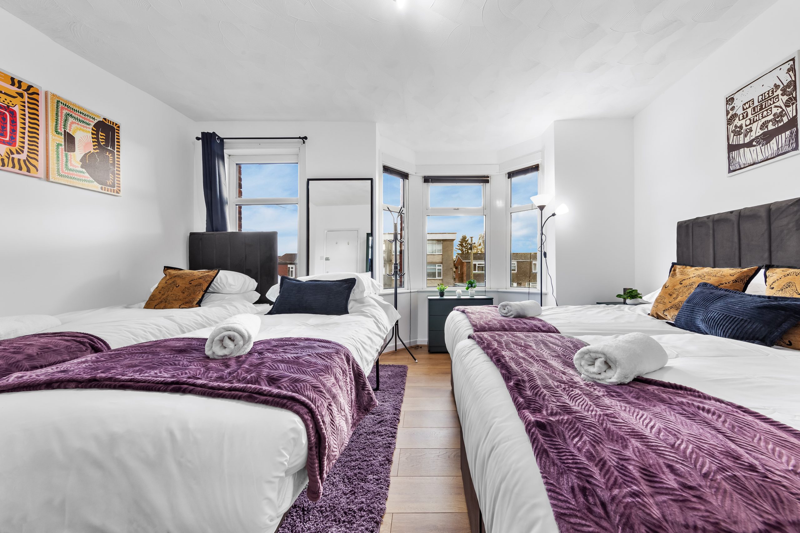 This spacious 3-bedroom house sleeps up to 9 guests and features flexible bed configurations, two bathrooms (including en-suite), superfast Wi-Fi and private gated parking. A fully equipped kitchen, dedicated dining area and comfortable living space make it well suited to extended work stays.