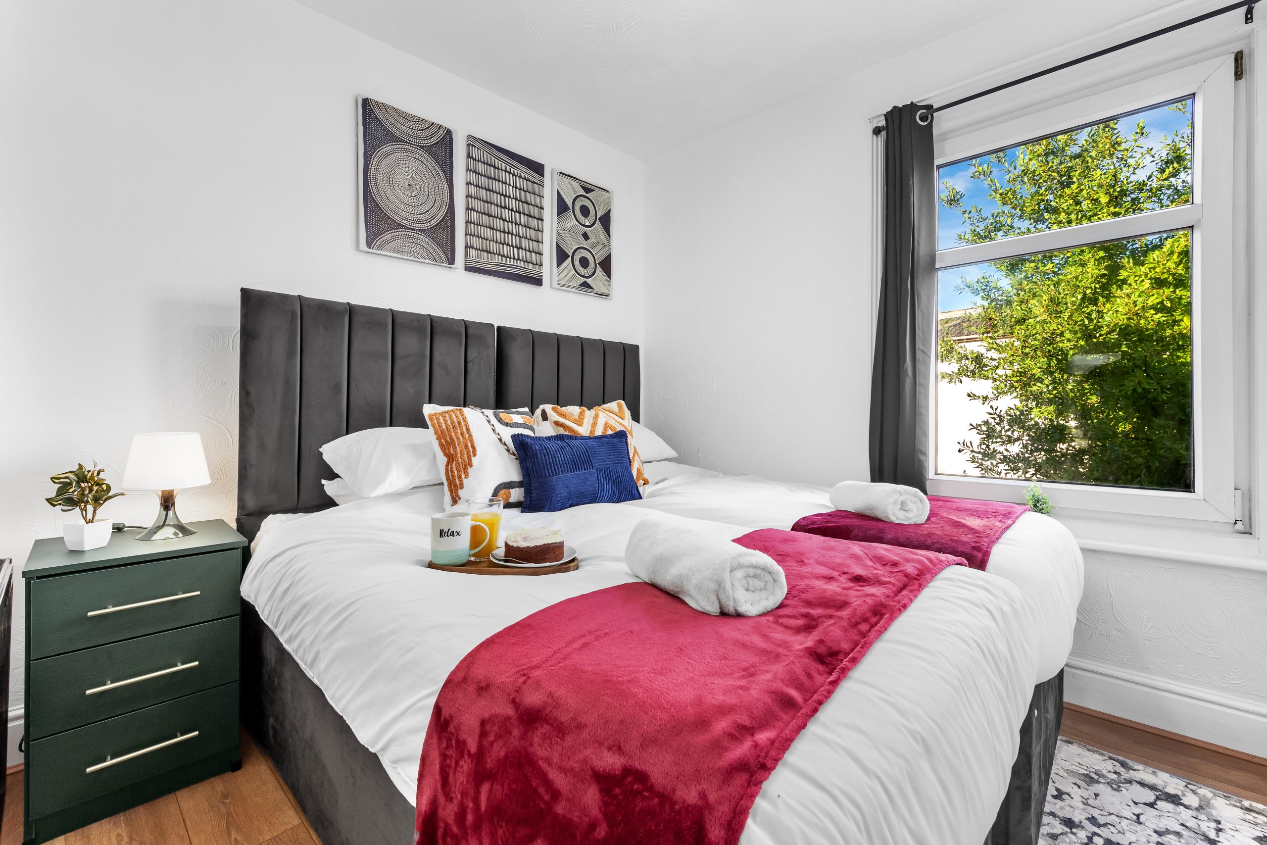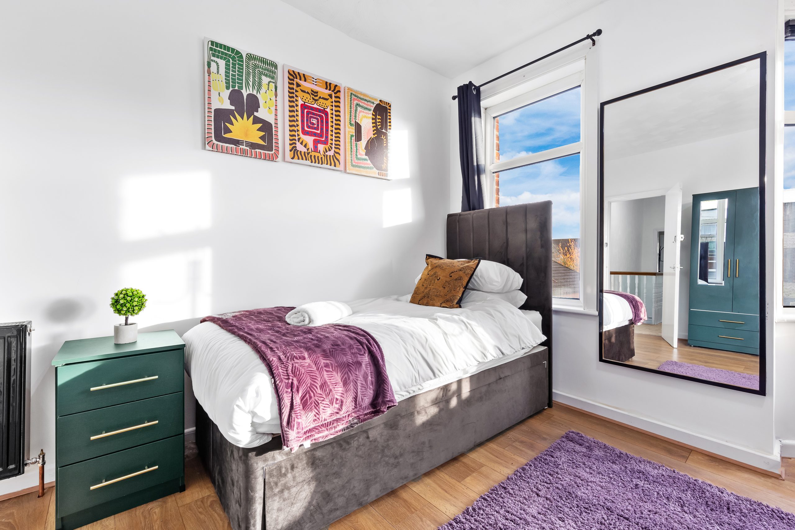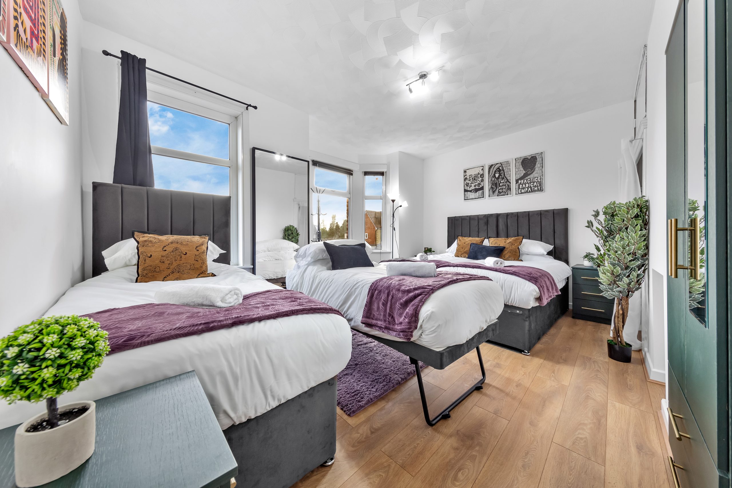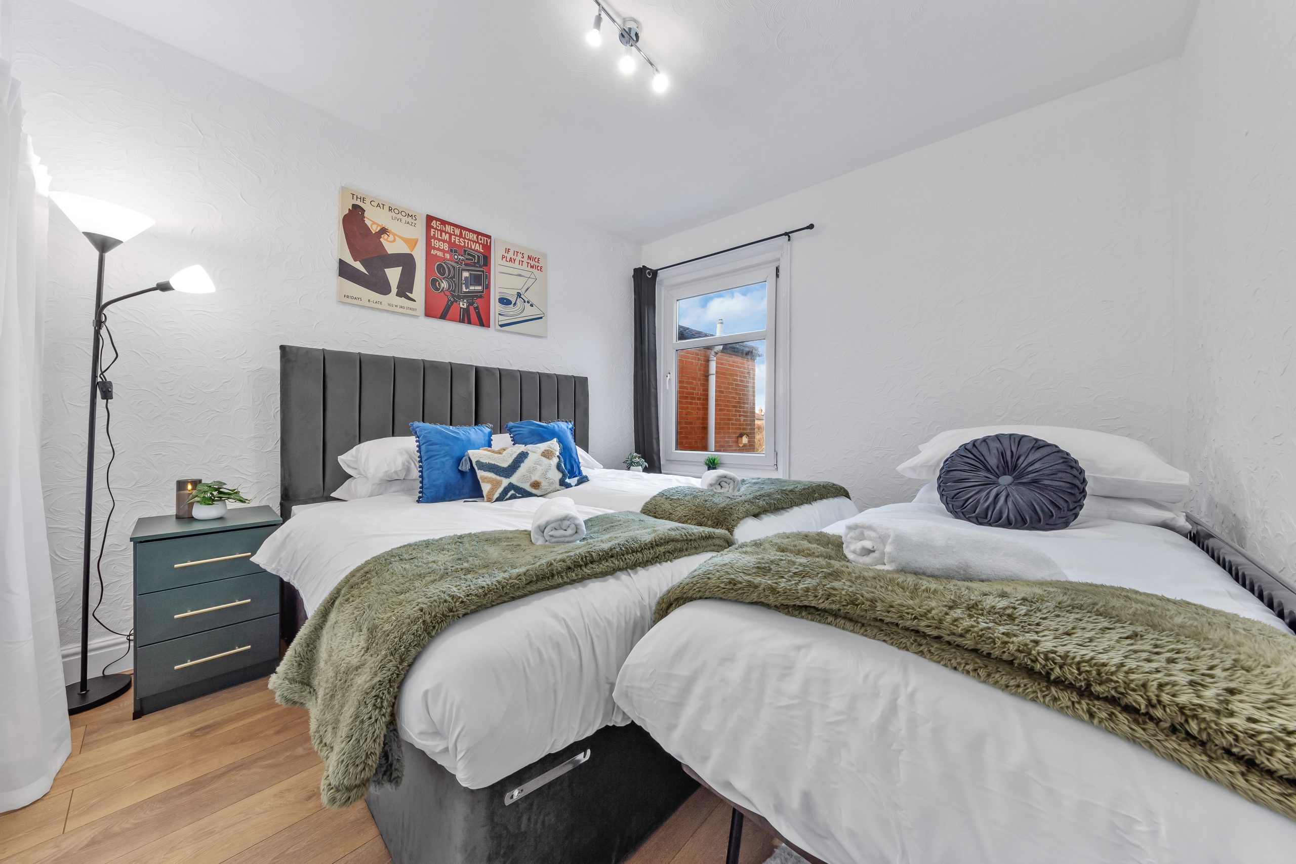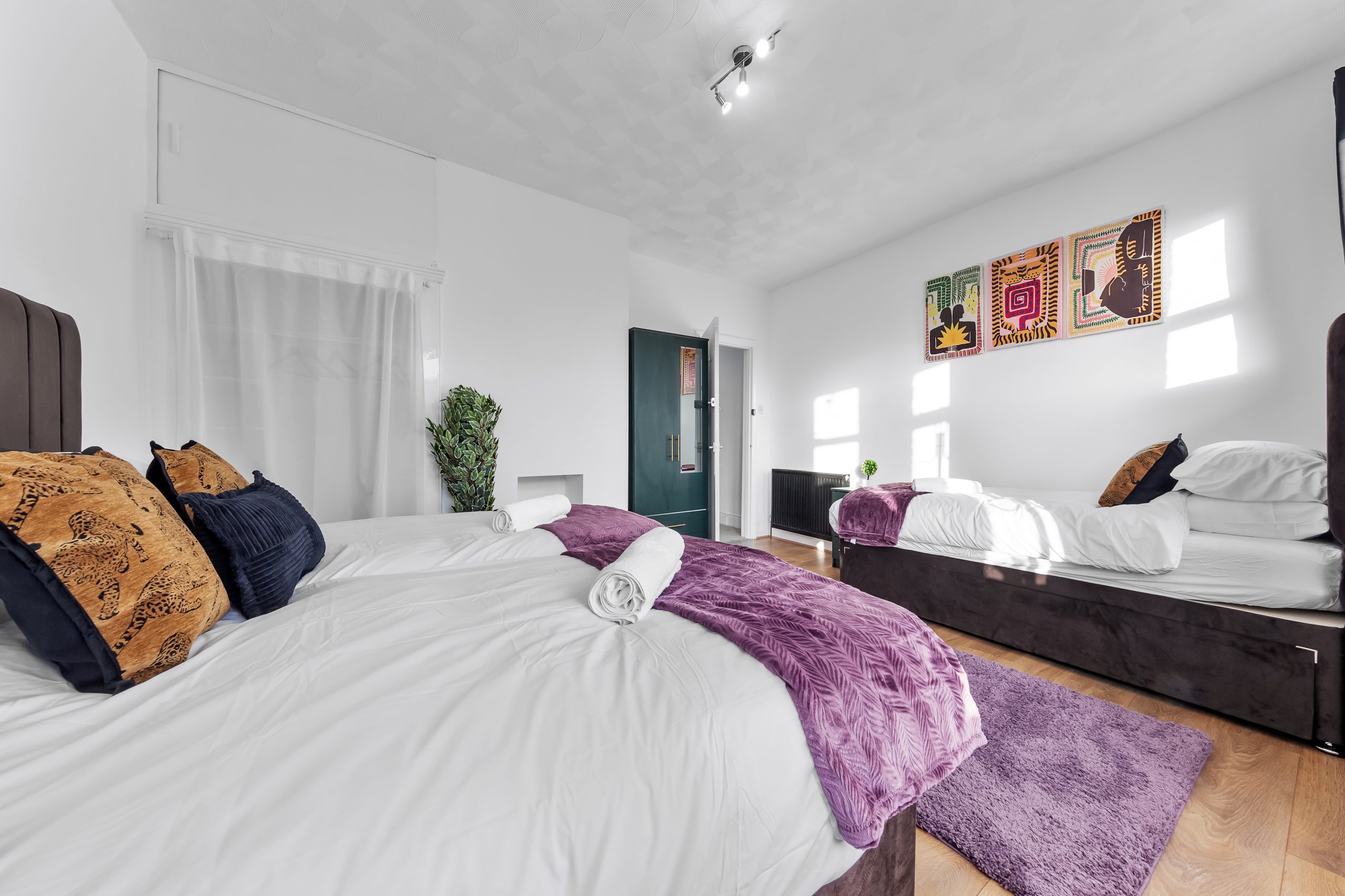 This spacious 3-bedroom house sleeps up to 9 guests and features flexible bed configurations, two bathrooms (including en-suite), superfast Wi-Fi and private gated parking. A fully equipped kitchen, dedicated dining area and comfortable living space make it well suited to extended work stays.