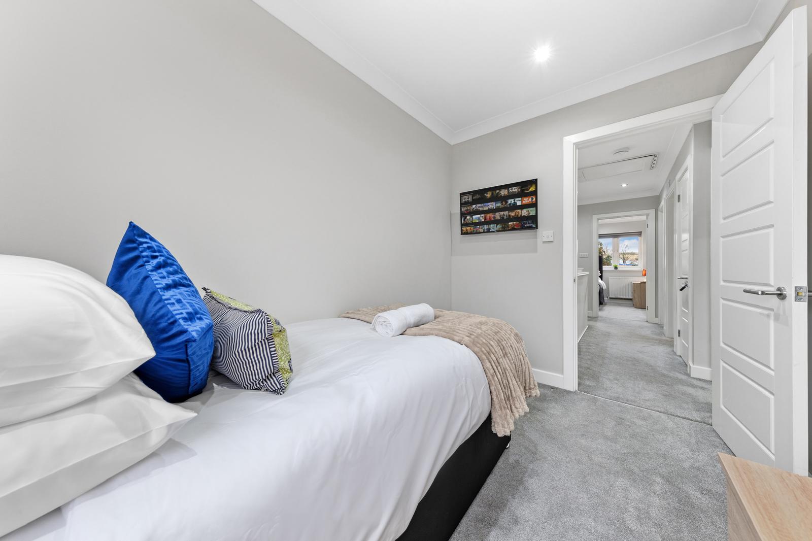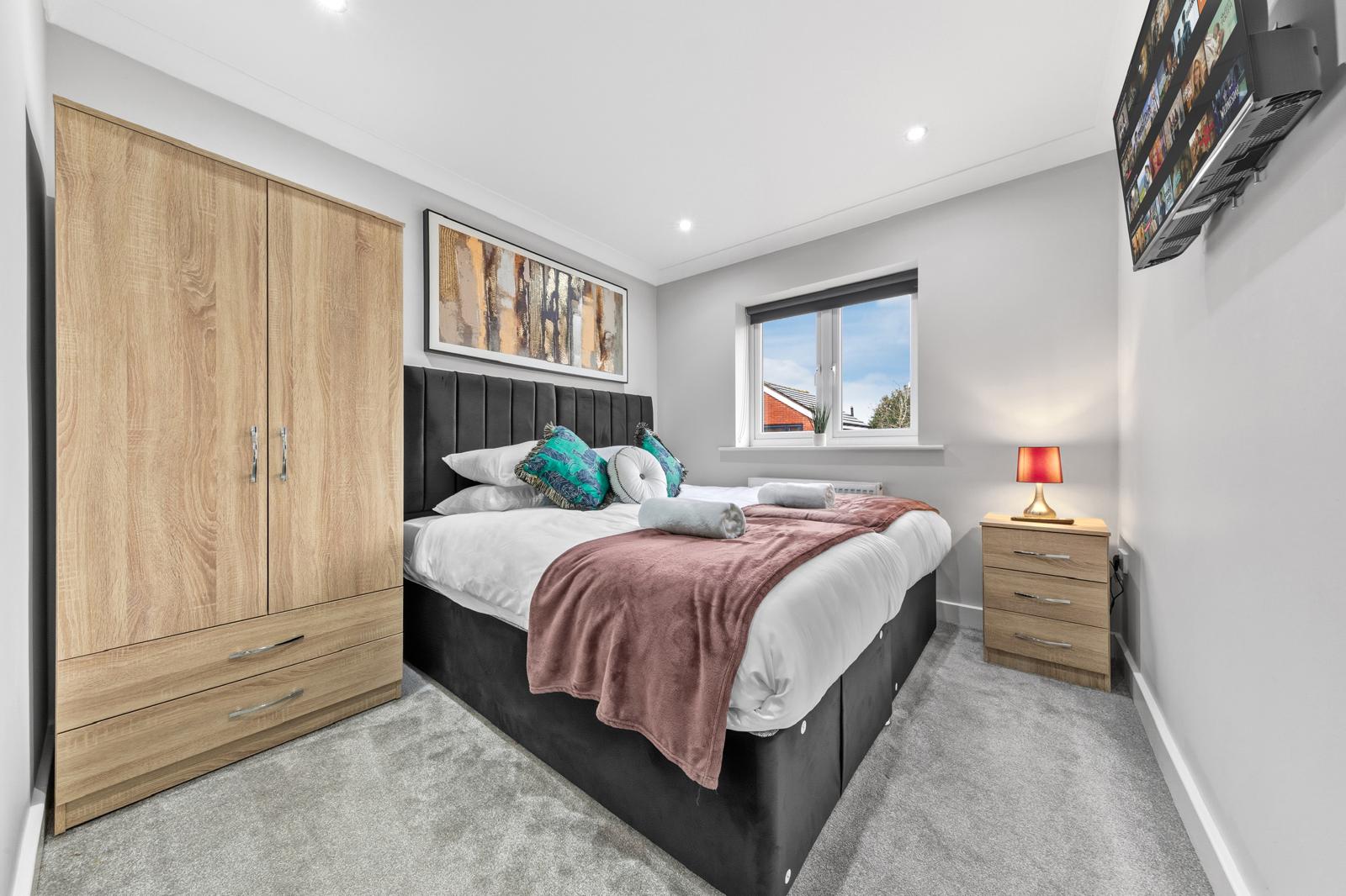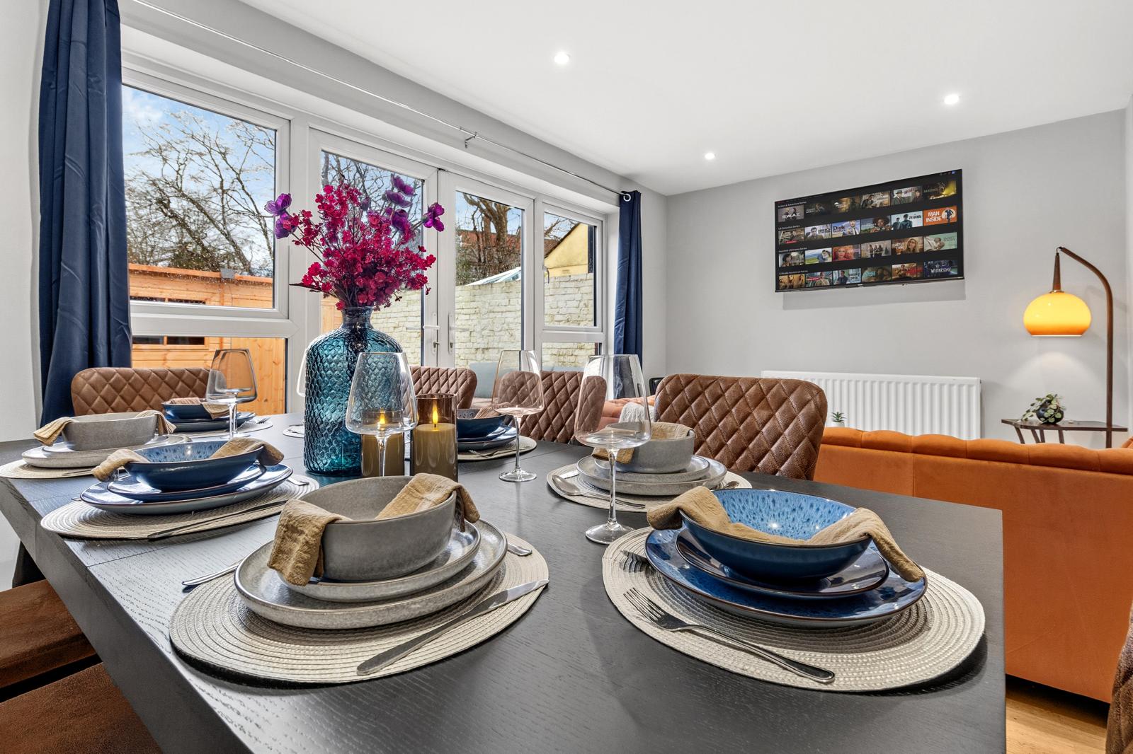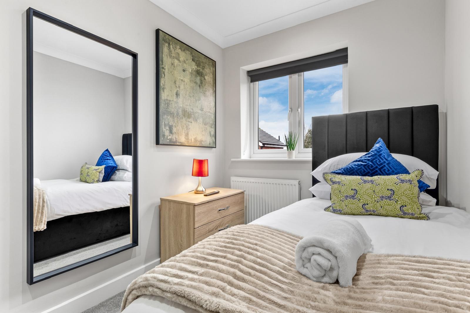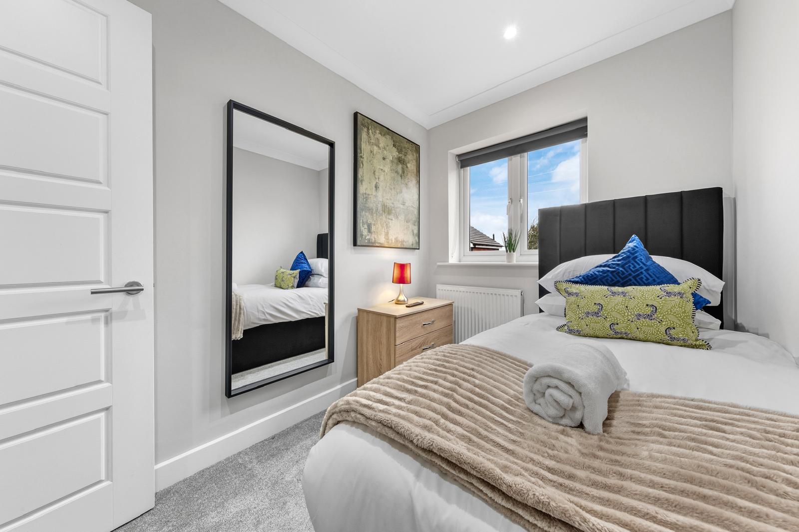 This substantial 5-bedroom house accommodates up to 8 guests and features 2.5 bathrooms, Smart TVs in every upstairs bedroom, superfast Wi-Fi and generous living and dining space for teams. The fully equipped kitchen, separate utility area with tumble dryer, and private fenced garden with games shed make it particularly well suited for longer stays.