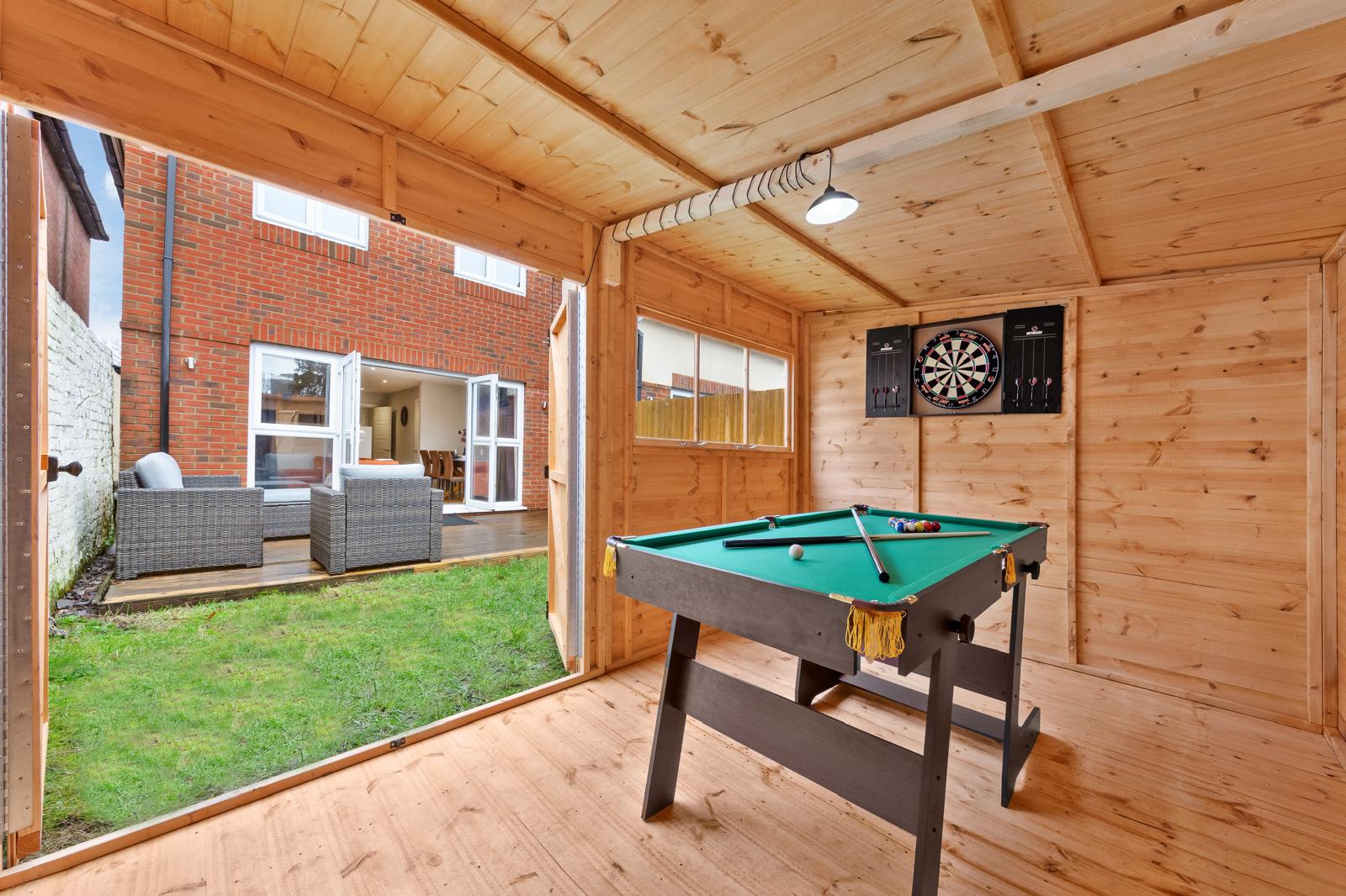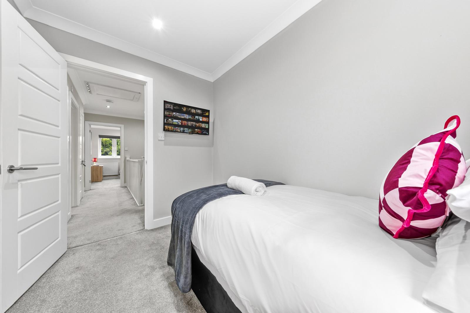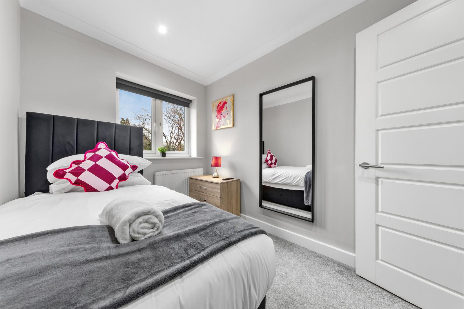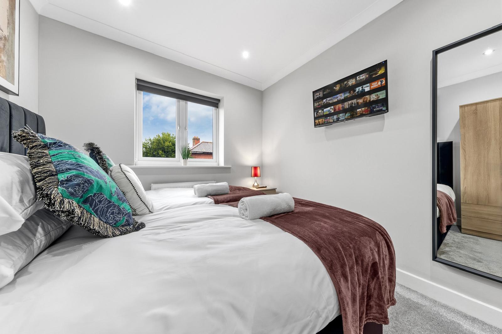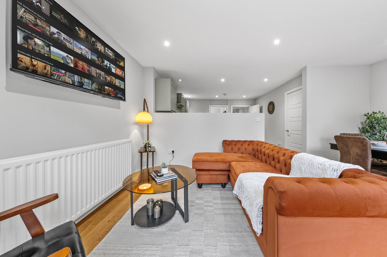 This substantial 5-bedroom house accommodates up to 8 guests and features 2.5 bathrooms, Smart TVs in every upstairs bedroom, superfast Wi-Fi and generous living and dining space for teams. The fully equipped kitchen, separate utility area with tumble dryer, and private fenced garden with games shed make it particularly well suited for longer stays.