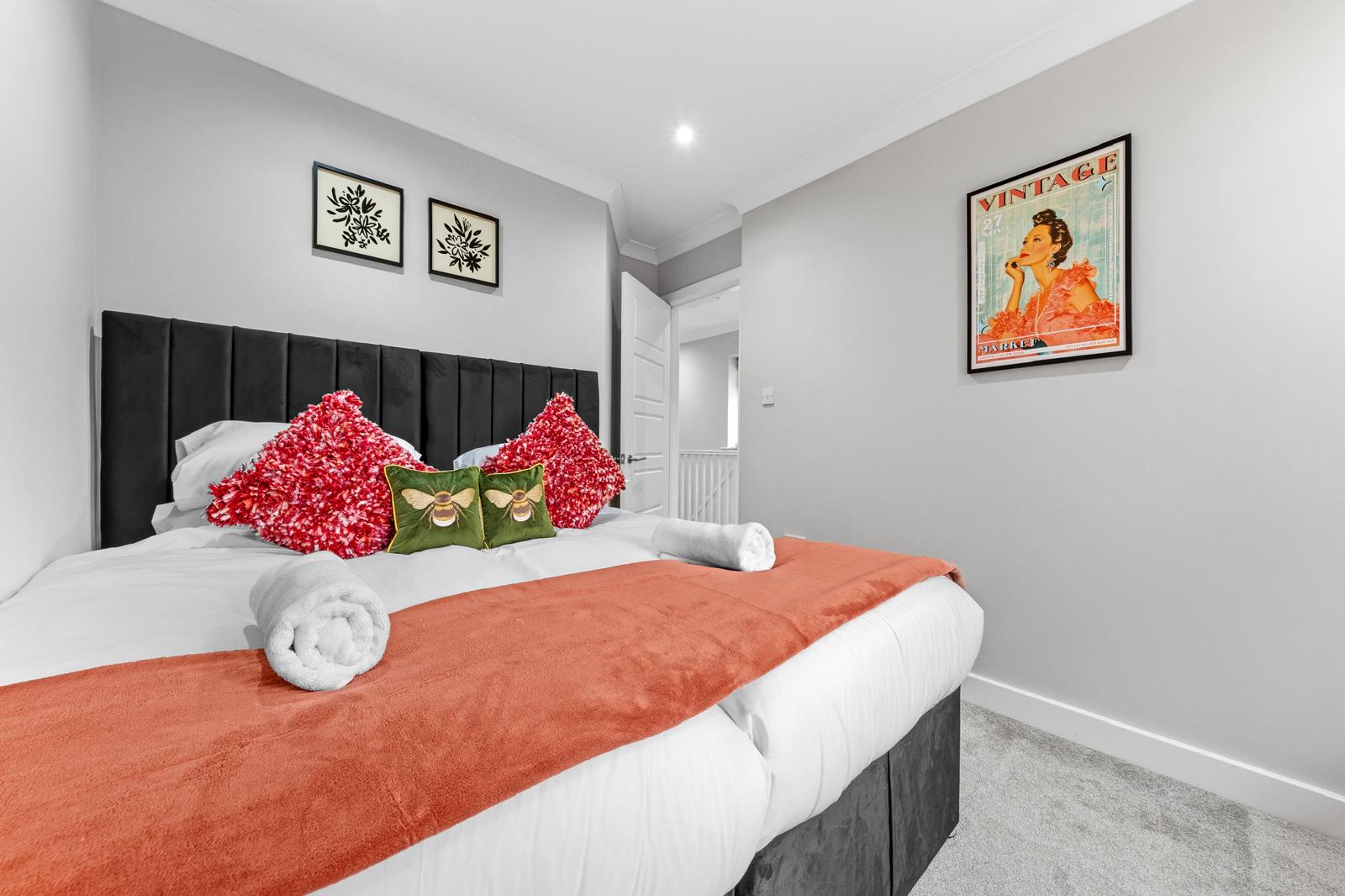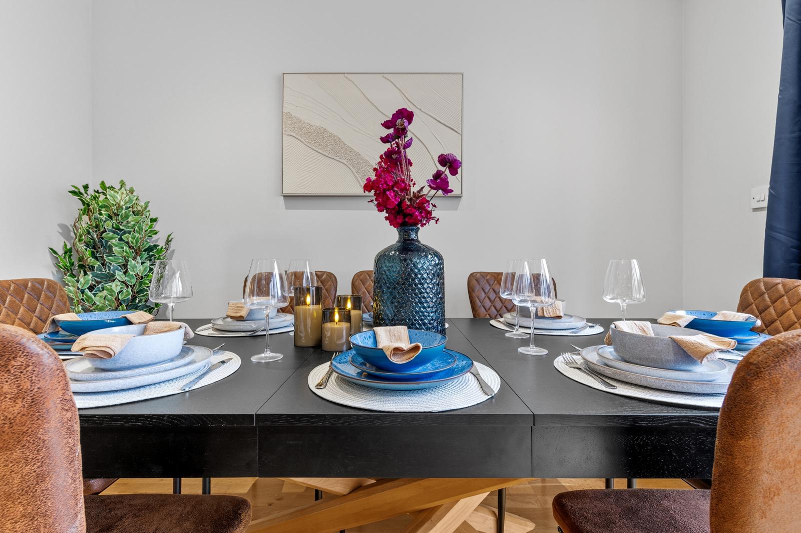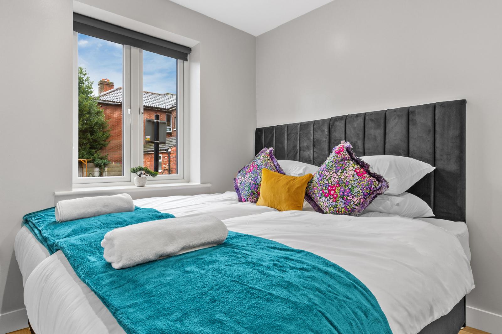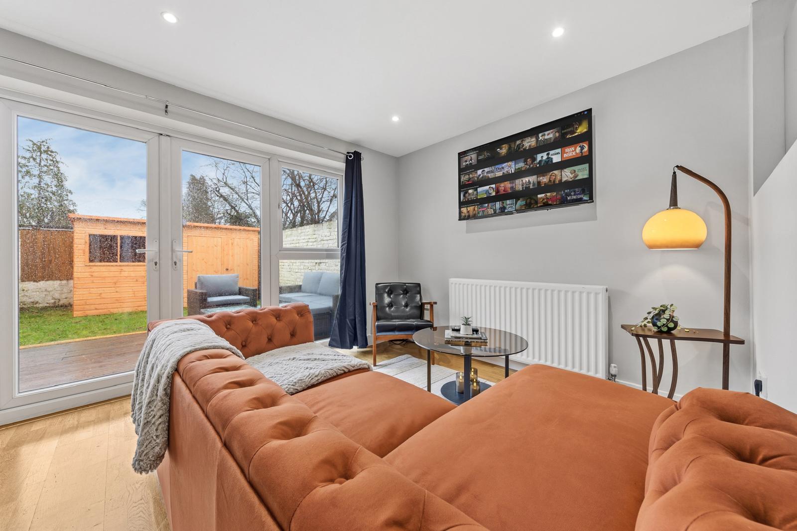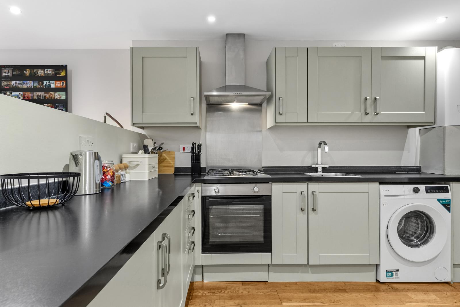 This substantial 5-bedroom house accommodates up to 8 guests and features 2.5 bathrooms, Smart TVs in every upstairs bedroom, superfast Wi-Fi and generous living and dining space for teams. The fully equipped kitchen, separate utility area with tumble dryer, and private fenced garden with games shed make it particularly well suited for longer stays.