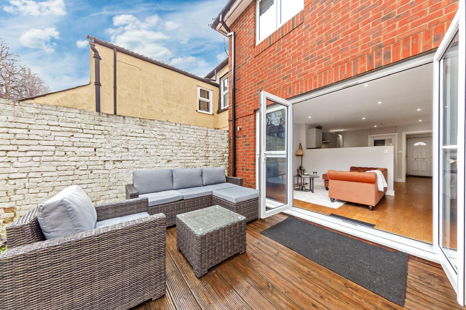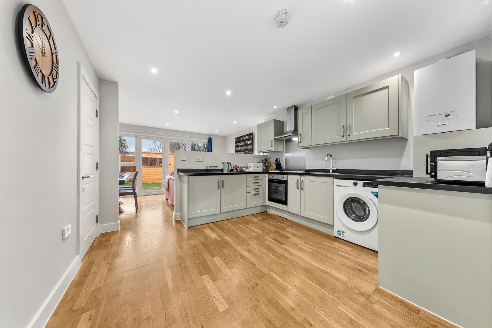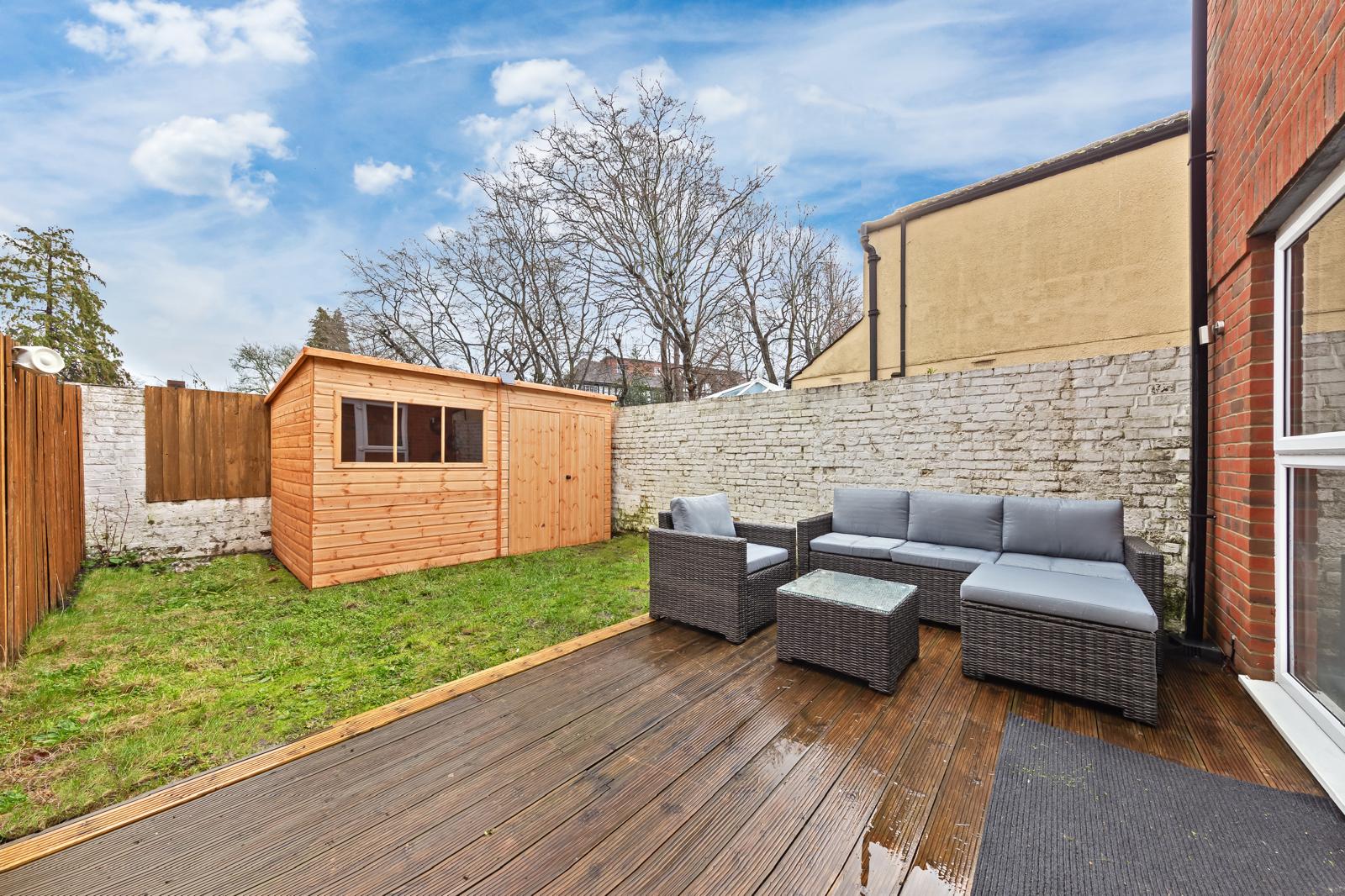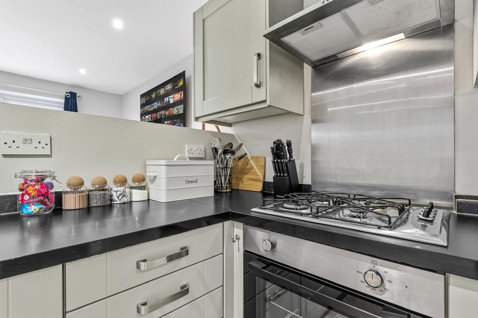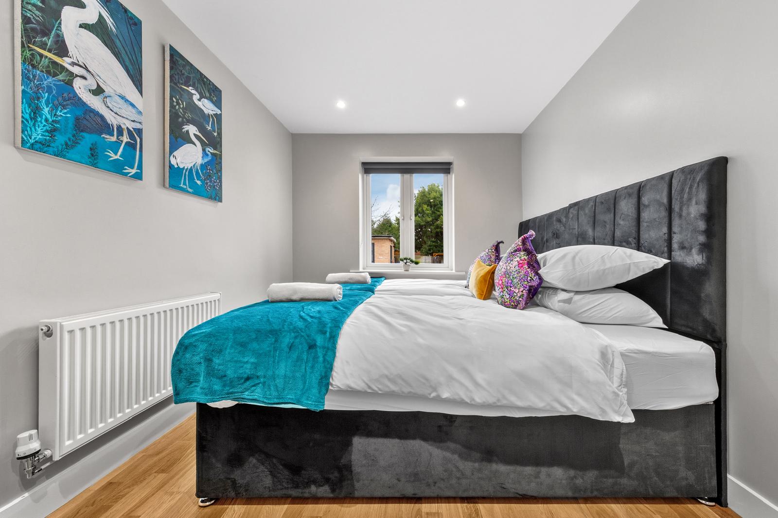 This substantial 5-bedroom house accommodates up to 8 guests and features 2.5 bathrooms, Smart TVs in every upstairs bedroom, superfast Wi-Fi and generous living and dining space for teams. The fully equipped kitchen, separate utility area with tumble dryer, and private fenced garden with games shed make it particularly well suited for longer stays.